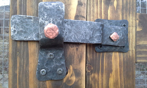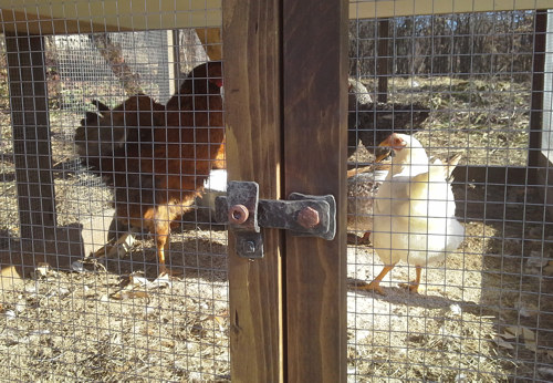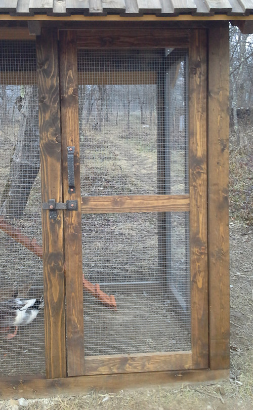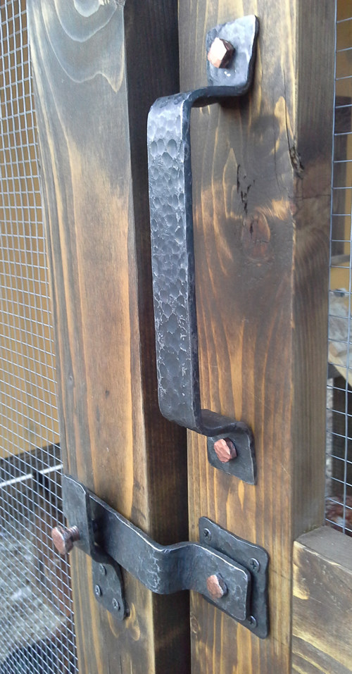 Вместо стандартната кокошкарска мрежа сложихме по-здрава, по-красива и по-сигурна запоена мрежа, която да пази от намиращите се в изобилие наоколо лисици, чакали, невестулки, порове,  белки, златки и прочие хищници. И понеже някои от тия зверчета са доста умни и могат да отварят обикновени резета решихме да направим специално сюрме от ковано желязо, където заключването става с помощта на болт, който се навива и притиска много здраво езика на резето.