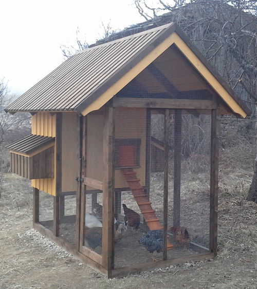 Селски кокошарникПринципно кокошарника беше предвиден за може да се мести, затова е направен по-малък и не е поставен на перманентна основа  а върху трамбован чакъл.  Обаче се получи доста тежък и местенето му е почти невъзможно.