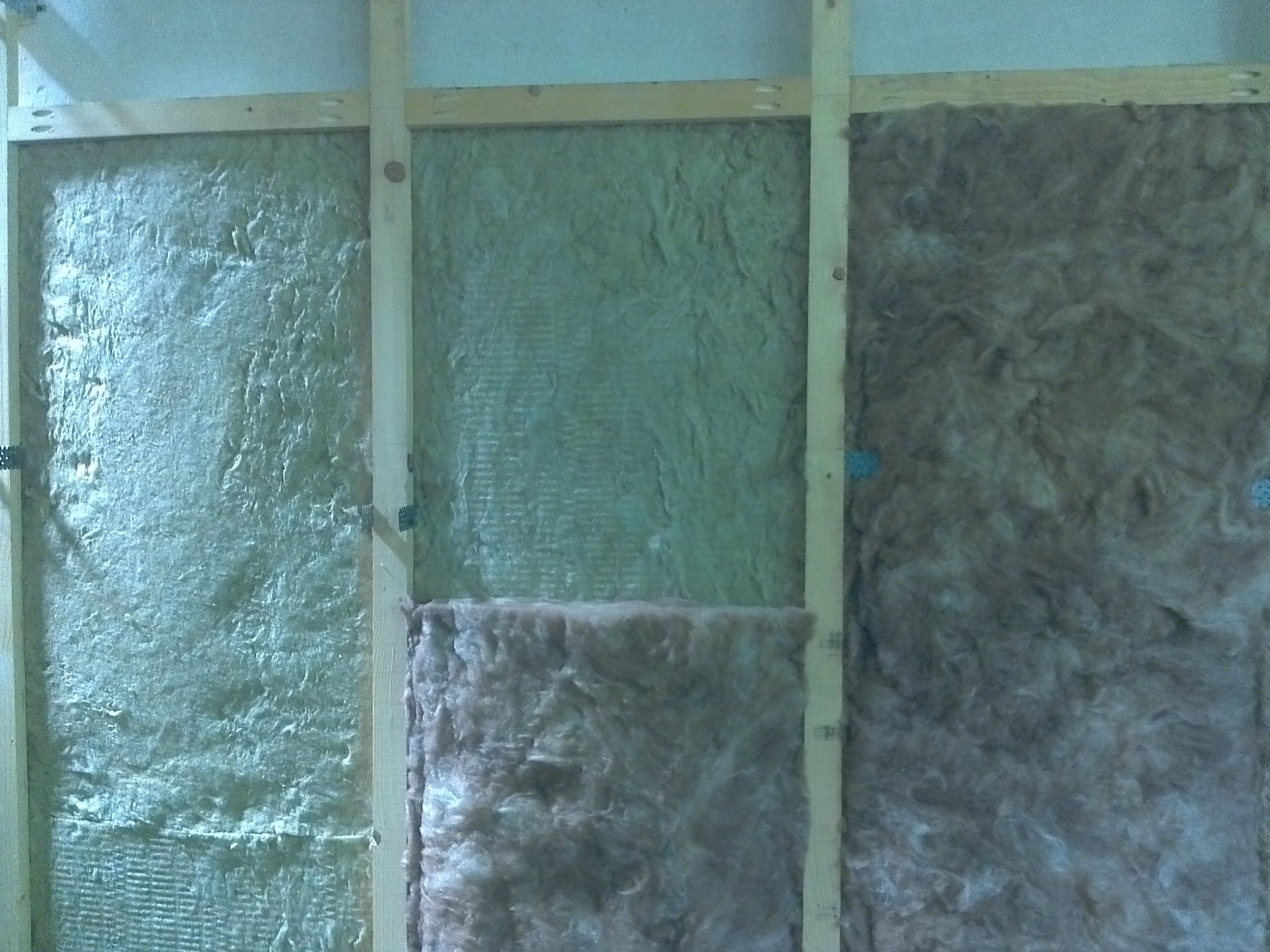 След завършване на изправящата стените конструкция се поставя ватата за изолация. Тук има различни варианти с които човек може да изолира стените. В моя случай аз използвах кафявата вата на Knauf от серията Eco-SE за която се твърди че не съдържа формалдехид. Но тъй като тя е лека вата и може да се свлече в стените, може да се използва в комбинация с каменна вата, която е 30 кг./кубик и по-леката (и по-евтина) вата прави сцепление с каменната и няма как да се свлече.