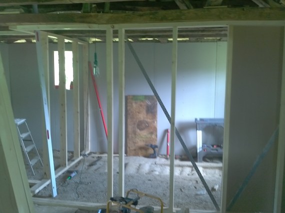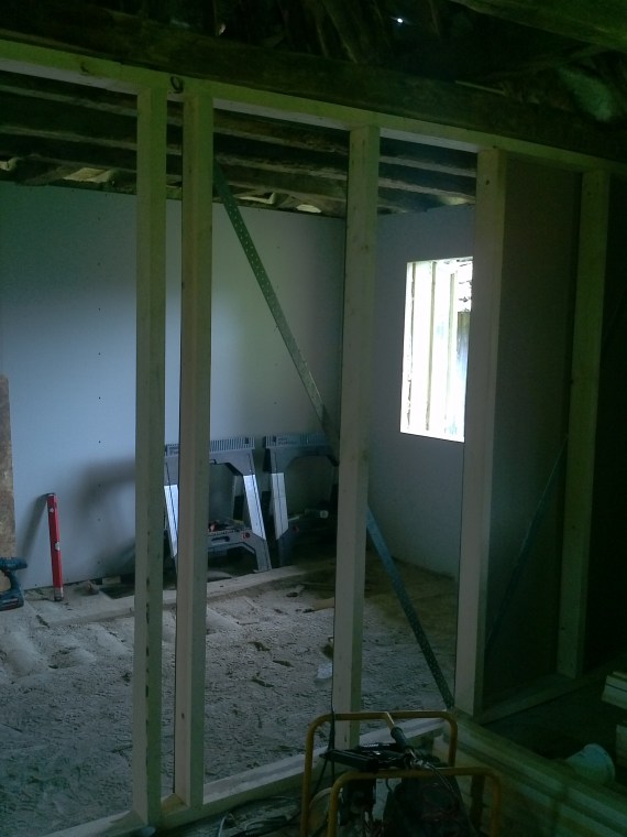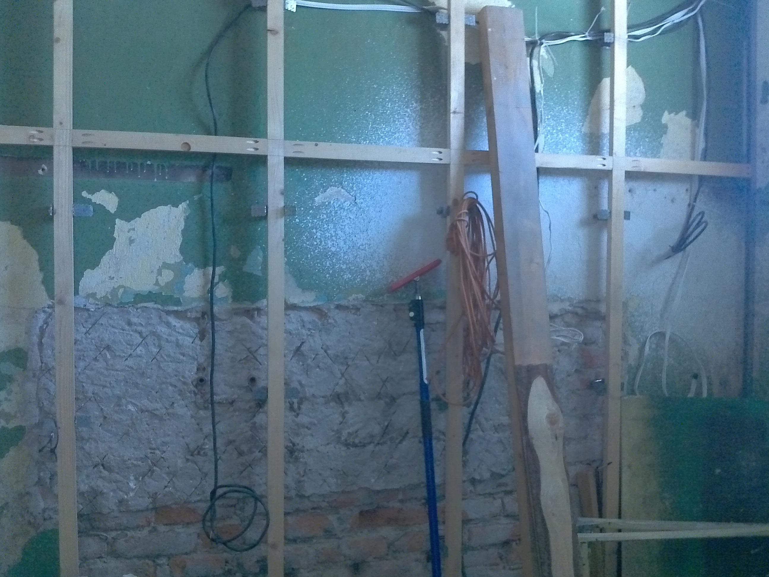 И така при мен се получи вътрешна изолация на външните стени между 5 и 12 см в поради голямата денивелация. Точно поради тази причина аз реших, че вместо да изправям интериорните стени (които бяха много криви) най-добре ще бъда да ги направя наново. Затова махнах кирпича и ги направих наново с дървена конструкция, както се вижда по-долу: