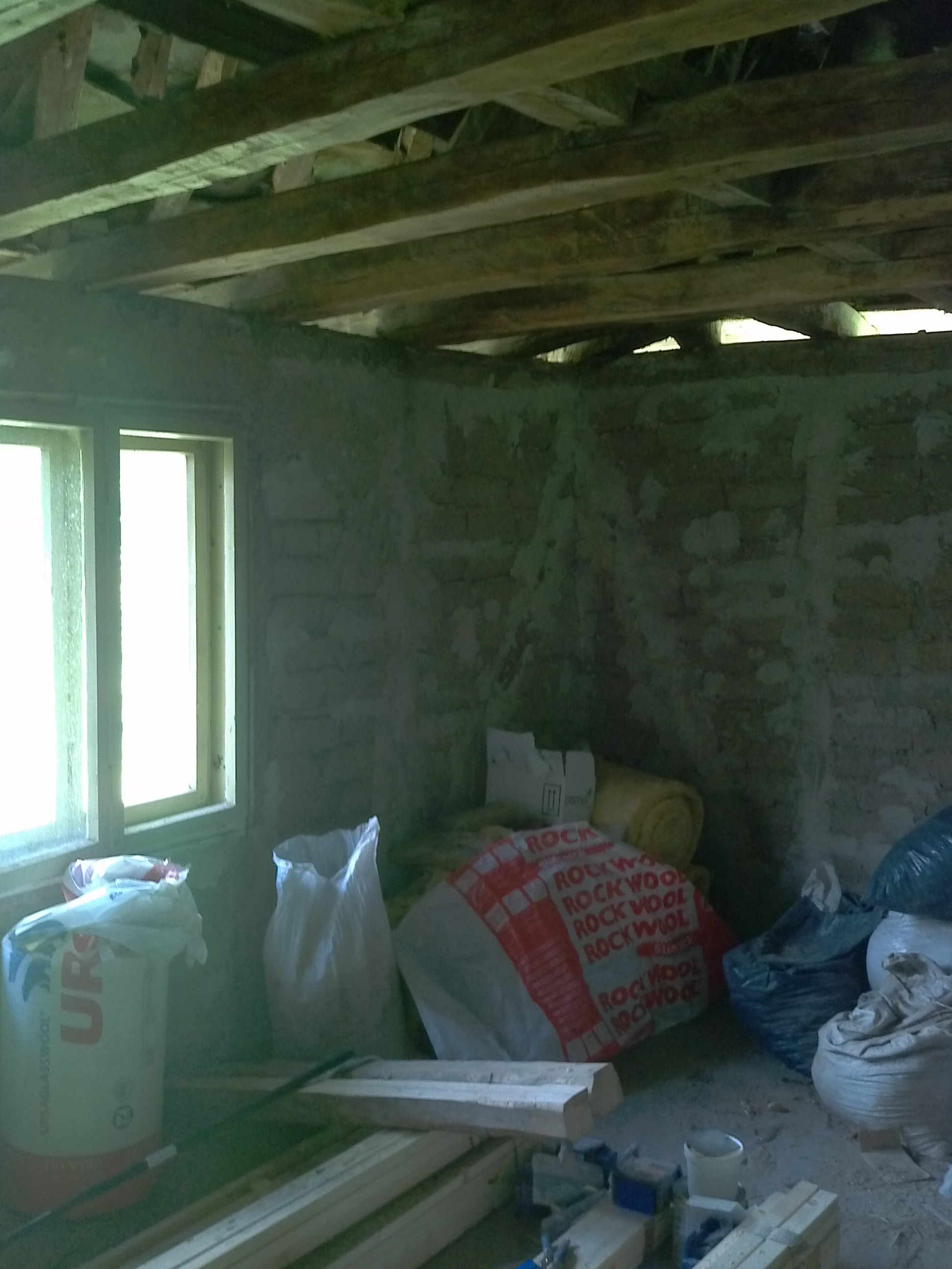 Първото нещо, което трябваше да направя бе да сваля накованите за тавана дъски и да сваля сложената отгоре пръст, която е била предвидена да служи за изолация. Като се вземе предвид факта, че пръстта не е много ефективен изолатор и че количеството й беше по-скоро минимално, беше ясно, че тя трябва да се замени с нещо по-добро. Също така накованите на тавана дъски сваляха много височината на тавана и скриваха носещите греди. Затова сваляйки ги аз едновременно си дадох възможност да направя видими гредите на тавана, а също така и леко да увелича височината на и без това много ниския таван.