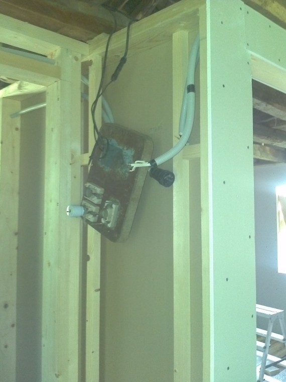 На снимката се вижда мястото предвидено за ново ел. табло на което временно е закачено старото ел. табло на къщата. Тук има няколко момента на които да се обърне внимание. Първо използват се максимално защитени кабели от клас СВТ. Второ всички кабели се поставят в негорими гофри. И трето местата където кабела излиза или влиза в гофрата се запечатва с изолирбанд, за да не преминава през нея  въздух и водни пари.
