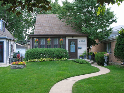 Ето една илюстрация на това как дори и една гаражна врата може да бъде освежена и преобразена чрез добавянето на някои елементи. Удивително колко много е постигнато за цялостното излъчване чрез поставянето на дървена пергола с подпори над вратата. Окачените фенери и висящите саксии с цветя допълват красивата гледка.
