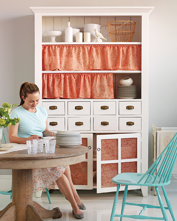 Има нещо много уютно и свежо в шкафовете с перденца. Подходящо подбраните пердета като цвят и материя могат да служат като красива декорация и да разнообразят дори и един съвсем обикновен шкаф, или да обогатят дизайна на някой интересен и майсторски изработен дървен шкаф като този: