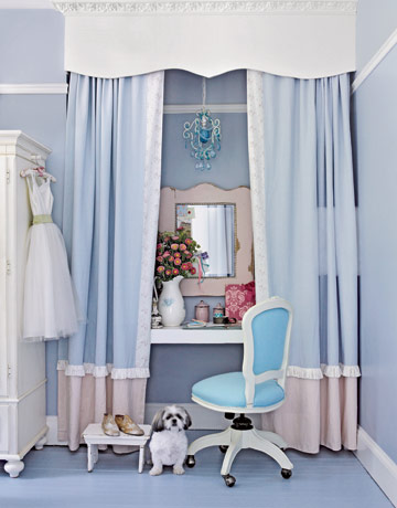 Подобна идея за поставянето на бюро във вградена ниша, скрита зад завеси, би била много подходяща, особено за стаята на малкото момиче. Красивите завеси, както и този забележителен широк бял корниз над тях, създават усещане за стил, уют и оригиналност, което се допълва от използването на ретро елементи и декорации в интериора на стаята.