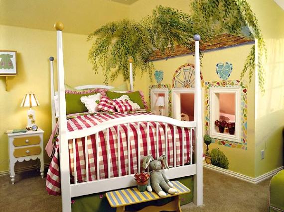Идеята в интериора на детската стая да се включат малки библиотеки във формата на къщички може да направи дизайна на стаята разнообразен и интересен за детето. Мебелите в тази детска стая биха изглеждали стандартни и обикновени, ако дизайнът на леглото не беше обогатен с предна табла, направена във формата на симпатична детска библиотека-къщичка.