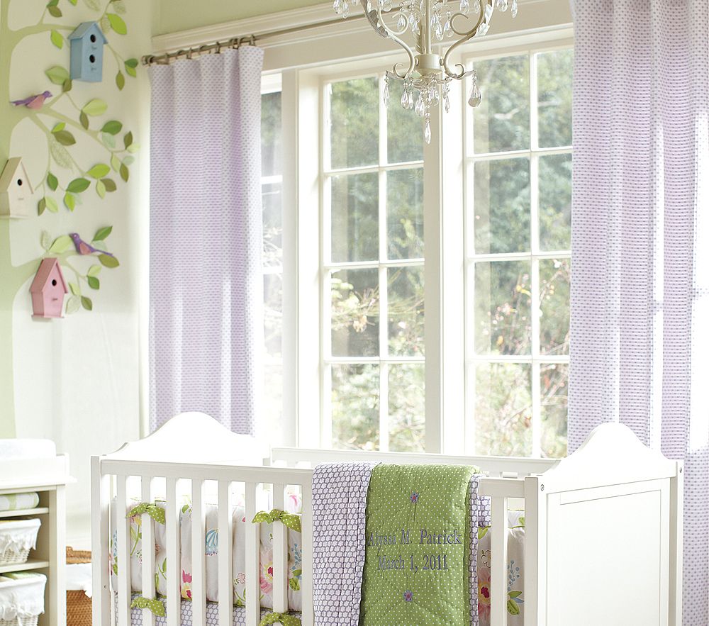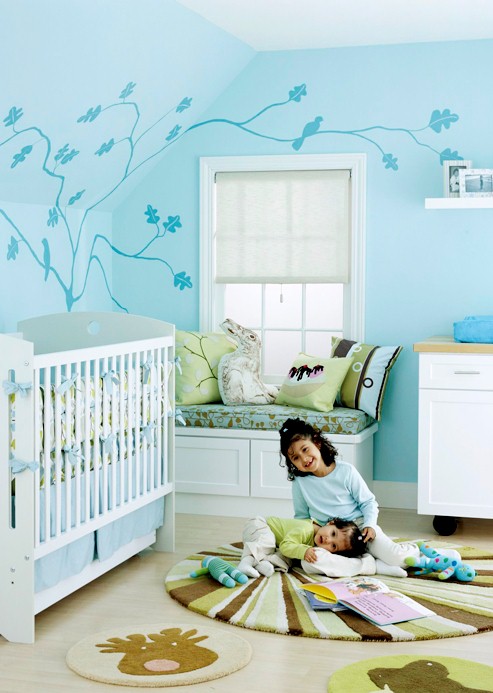 В тази бебешка стая можем да видим колко добре светло синият цвят на стените е балансиран от белия цвят на трима около прозореца и на широкия перваз на пода, както и от белите мебели. Бялото дава възможност за използването на по-тъмни цветове за стените на една стая, като същевременно се запазва усещането за простор и светлина в помещението. В България не е толкова застъпено използването на подобни елементи и това е една от причините дизайните на детски стаи, независимо дали в частни домове, или демонстрираните такива в магазини или изложбени зали, да изглеждат някак незавършени и плоски.