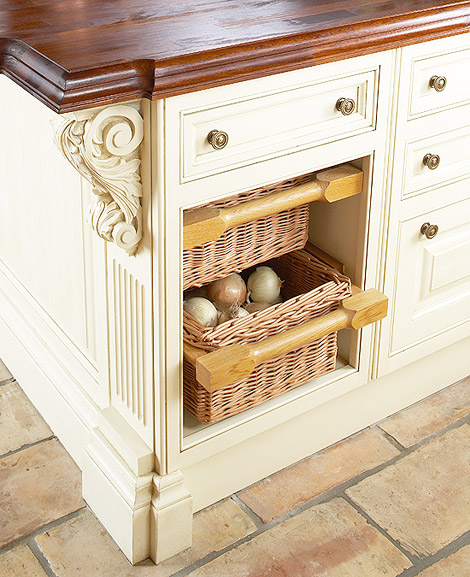 Красивите плетени кошници винаги са намирали своето място в кухнята като удобен начин за складиране на запаси от плодове и зеленчуци, покривки или някакви кухненски принадлежности. Но освен в тяхната практичност, гледки като тази могат да ни убедят и в това колко добре биха паснали те визуално на една кухня с по-традиционен дизайн.