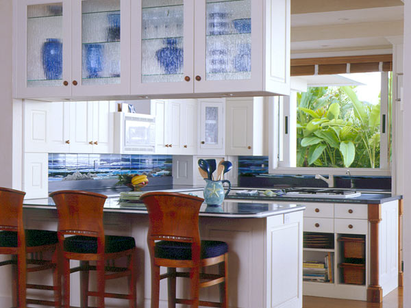 Много сполучлива е идеята стъклата на вратичките да са матирани, а през тях да загадъчно да прозират сините декоративни вази и съдове. Шкафовете над бар плота обикновено визуално отделят пространството между кухнята и трапезарията/хола, и тяхното стратегическо място със сигурност оправдава използването им най-вече с декоративна цел.
