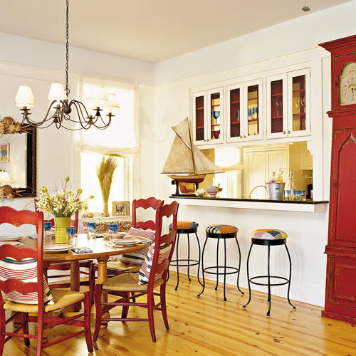 Страхотна е и цветовата гама, в която е решен интериорния дизайн на тази част от жилището. Класическото комбиниране на червено, бяло и синьо предразполага към постигане на добър контраст и ефектна обстановка.