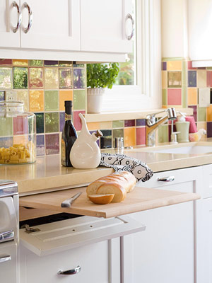 Тази колоритна кухня в бяло може да ни даде някои свежи идеи за ефективност и дизайн. Издърпващата се дъска за рязане е много удобен кухненски аксесоар, особено ако се налага да оптимизираме пространството в една малка кухня. Дъската е скрита зад падаща вратичка, която външно погледнато имитира чекмедже. По подобен начин в една малка кухня може да се включи дори и издърпваща се малка маса.