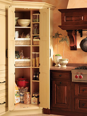 Можете да си направите голям ъглов шкаф, който да служи като кухненски килер с множество рафтове и отделения. Всяка една кухня има нужда от значително място, в което да поберете и организирате хранителните продукти от типа на варива, консерви, буркани с консервирани храни, буркани с подправки, както и различни видове дребни кухненски принадлежности. Един ъглов килер ще ви осигури значително пространство за тази не лека задача.