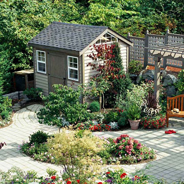 Тази страхотна градина е илюстрация на това как съчетанието на красивите градински структури и добре оформените, спретнати лехи с различни видове растения и цветя могат да направят един двор истинско райско кътче. Дървената градинска къщичка за инструменти е много повече от просто един склад, тя е акцентното място в градината, което допринася съществено за цялостното излъчване на двора.