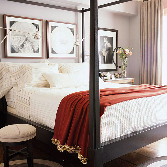 Светлите кремави цветове са идеален фон, на който да изпъкнат стилните тъмни мебели в спалнята и ярките аксесоари.